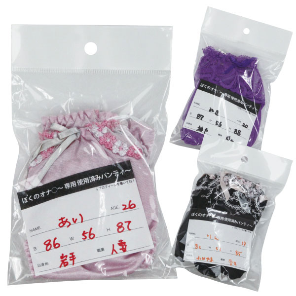 素人さんが持ち込んだ使用済みアイテムを、そのままパックしたかのようなリアル感!名前・年齢・スリーサイズの情報など、妄想しやすい生々しさで、オナニーがさらに捗るフェチグッズ!どんなデザインのパンティが届くかは、到着してからのお楽しみです。