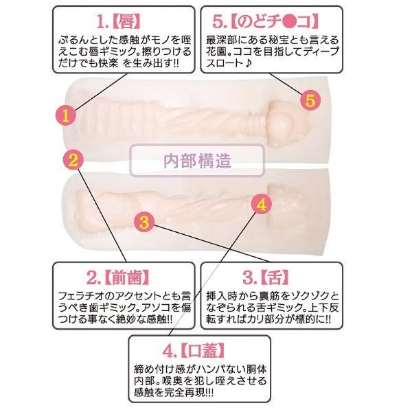●外観凹凸ナシのストレートボディ●リアルな女性の唇を模した挿入口●入口から覗く歯が絶妙アクセント●裏筋をニュルッと刺激する舌突起●ゾリゾリなぞる連続刺激の上あご●上下反転でまた違った快感に。
