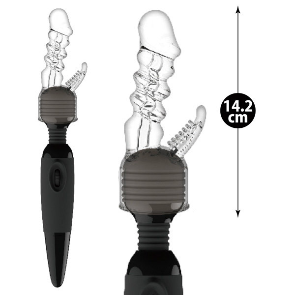 ●ヘッド直径4.5〜5.2cmの電マにセット●清潔感漂うクリアカラータイプ●先端が張り出したバイブ風ボディ●波打つ凹凸竿で挿入にアクセント●クリトリス刺激のブラシ突起付き●同型の黒色タイプ(b24917)も。