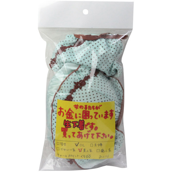 お金に困っている素人さんが持ち込んだアイテムを、そのままパックしたかのようなリアル感!どんなデザインの上下セットが届くかは到着してからのお楽しみ!ぜひ買い取ってあげて下さいね。
