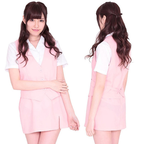 白ブラウスに淡ピンクの組み合わせがキュートさ満点!ベストのフロントは3つボタンのスタンダード型、セクシーなタイトスカートのサイドスリットデザインも見逃せませんね。