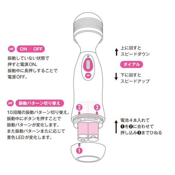 - パッケージ:20.5×6.8×6.8cm 本体:全長19.5cm ヘッド部直径4.5cm 持ち手太さ4.2〜4.7cm 重量:179g 電池:単三電池×4本使用(電池は付属していません)