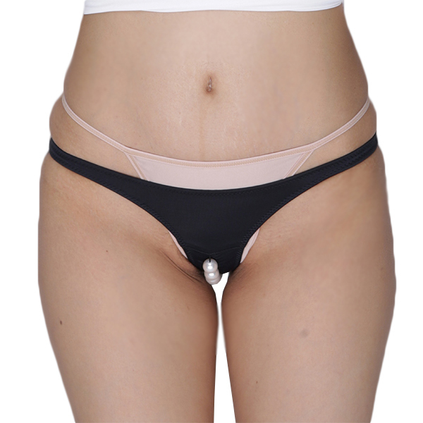シンプルな黒ショーツのクロッチ部分に大玉パールを付けた刺激的な日本製ハーフバック。