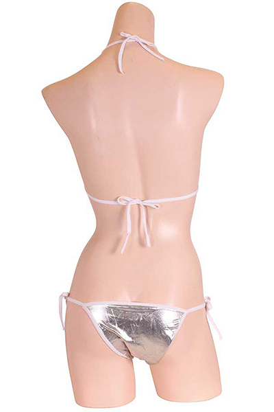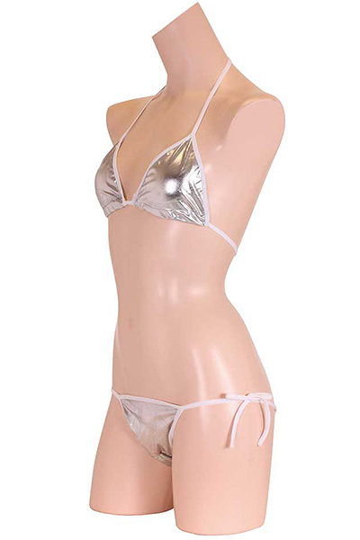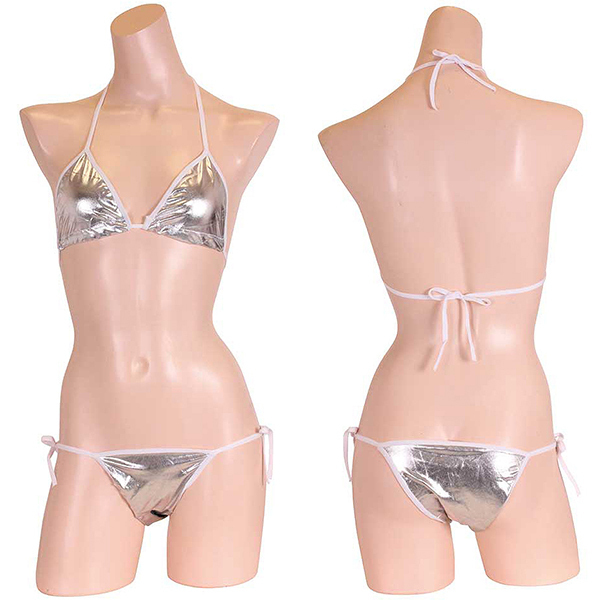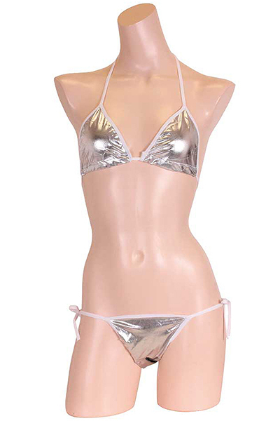 夏の浜辺でクールにキメる!上品な輝きを放つメタリック生地のシルバービキニ。