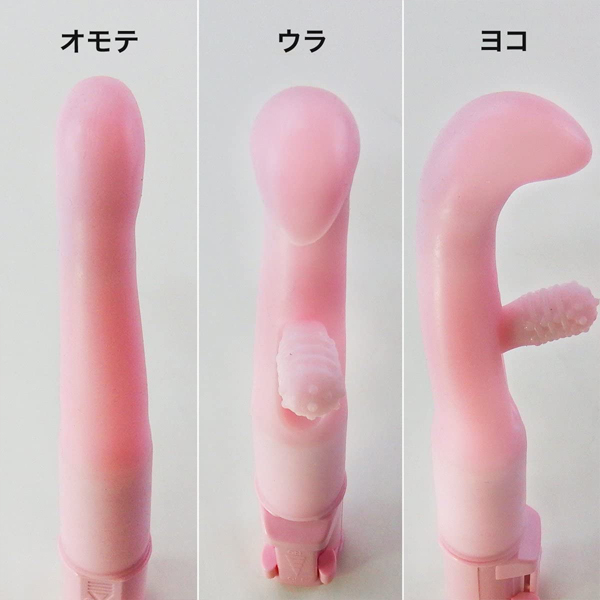 逆L字型の先端が快感部分を刺激しつつ、中腹に突き出たイボ付きの専用突起は挿入時に後ろへ倒れ膣内にフィット、超微細な振動でクリとGスポを刺激する!細めでツルっと挿れやすく、エラストマー素材で柔らかく仕上げた初心者さんでも安心のバイブです。