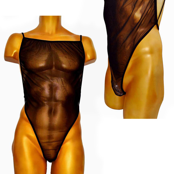 筋肉美を際立たせるシアー素材を使用した黒の男性用ボディストッキング。