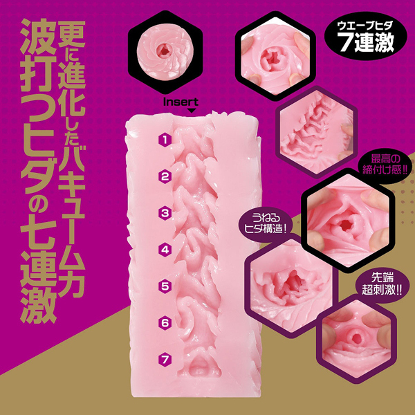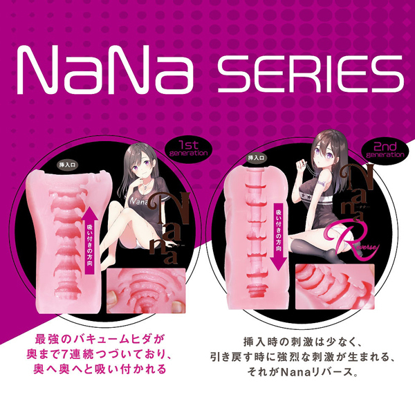 逆ヒダによるカリ刺激が特徴の「Nana(ナナ)Reverse(b29107)」がバキューム力を強化してさらに進化!全長15cm、内部長14cmの波打つ7連ヒダ構造の非貫通オナホ。