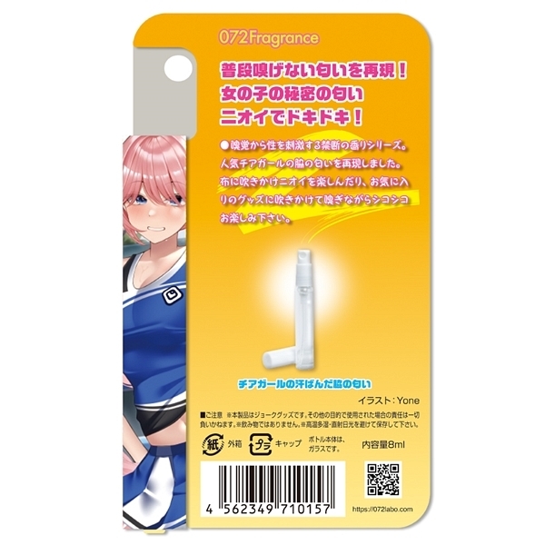 嗅覚から性を刺激する禁断の香りシリーズから「人気チアガールの汗ばんだ脇の匂い」がするエッチなニオイのフレグランスが登場しました♪人気チアガールのワキの匂いを再現!布に吹きかけて脇の匂いを楽しんだり、お気に入りのグッズに吹きかけて嗅ぎながらシコシコお楽しみ下さい。