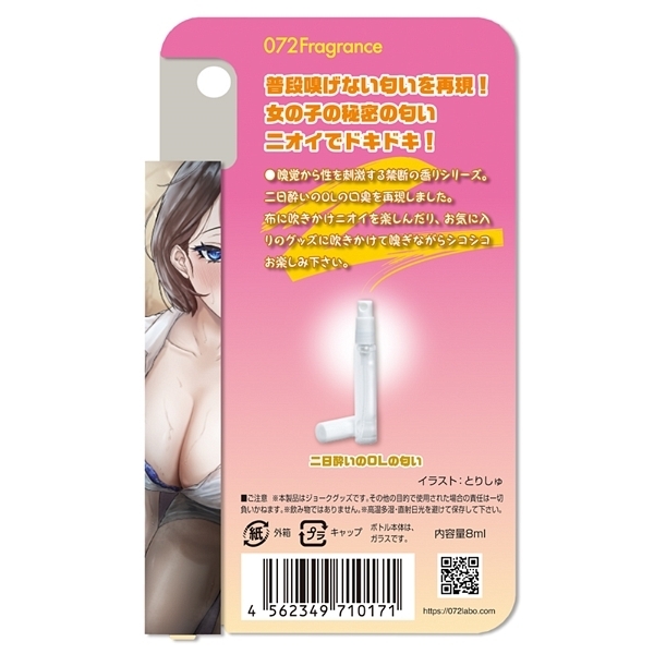 嗅覚から性を刺激する禁断の香りシリーズから「新人の女の子の二日酔いの朝イチの口臭」がするエッチなニオイのフレグランスが登場しました♪二日酔いOLの口臭の匂いを再現!布に吹きかけて脇の匂いを楽しんだり、お気に入りのグッズに吹きかけて嗅ぎながらシコシコお楽しみ下さい。