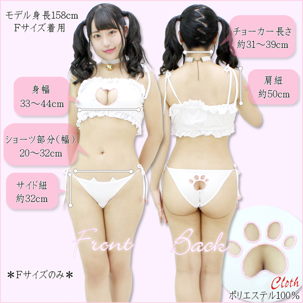 キミのために可愛くなるにゃん♪男女問わずハートを射止めるキュートな猫モチーフの水着が登場しました!フリル×猫のコラボレーション!ブラやショーツに所々取り入れられたネコが乙女心をくすぐります♪さらに後ろで留めるタイプの鈴つきチョーカーも付属。