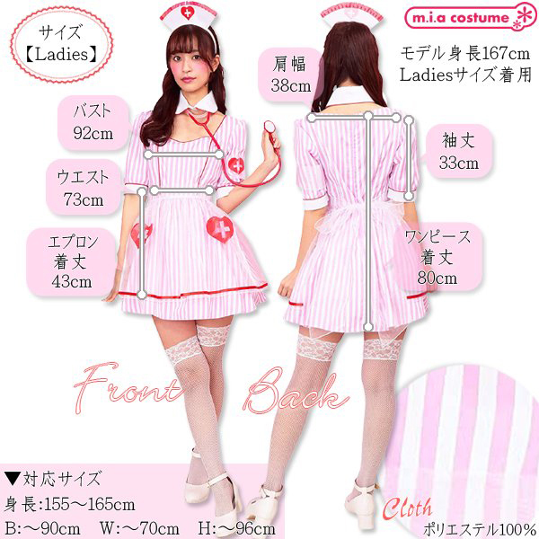 - Mサイズ 対応サイズ:身長155〜165cm・B〜90cm・W〜70cm・H〜96cm 実寸:B92cm・W73cm・肩幅38cm・袖丈33cm・着丈80cm、エプロン丈43cm セット内容:カチューシャ、付け襟、ワンピース(背中心ファスナー)、エプロン、腕章、聴診器 素材:ポリエステル100%