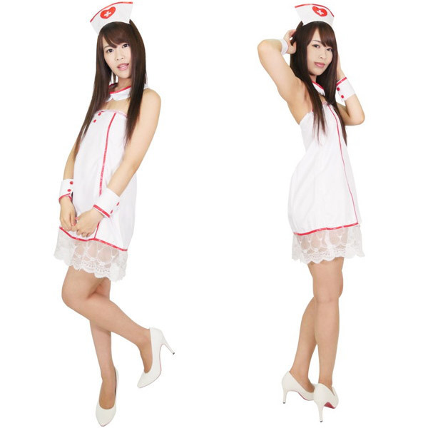 幅広の裾レースがポイントのワンピースと、カフス&付け襟&キャップがセットになったセクシーデザインのナース服コスチューム。