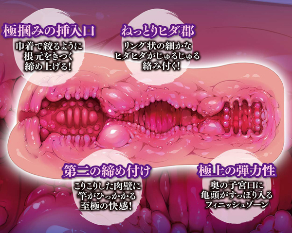 挿入口からアナタのムスコをキツく締め上げ中央の締め付けゾーンで竿全体を刺激!ストロークごとに快感は高まり最深部の子宮口へ絶頂フィニッシュ。
