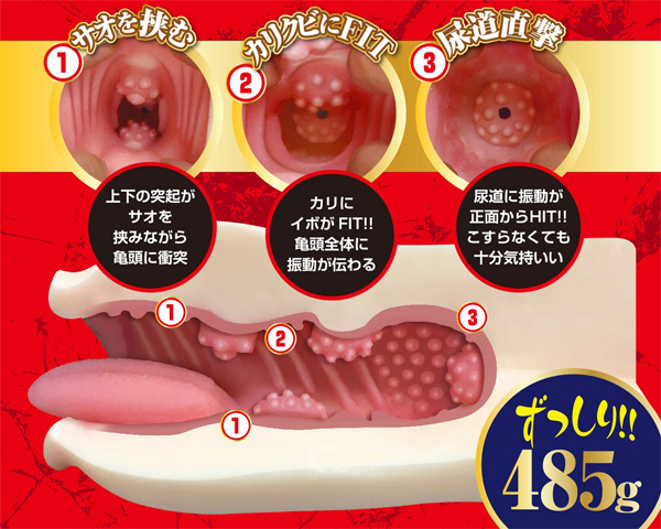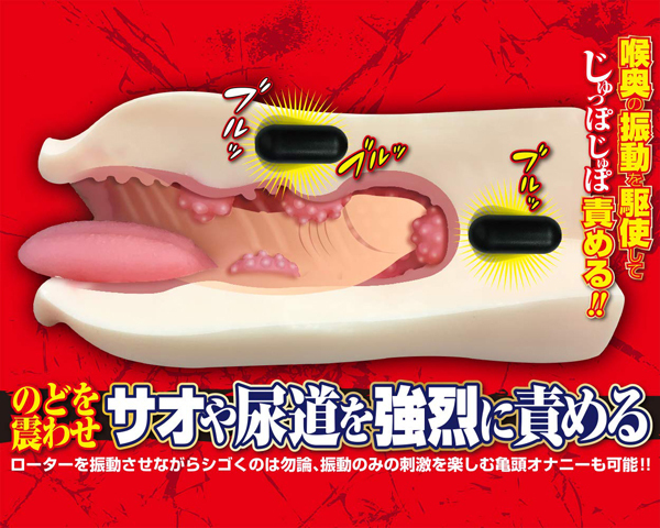 のどを震わせサオや尿道を強烈に責める!!最強のフェラ技「口蓋振(こうがいしん)」を楽しめるフェラホール!ローターを振動させながらシゴくのは勿論、振動のみの刺激を楽しむ亀頭オナニーも可能!!奥まで挿入すれば亀頭をロックしながら尿道に振動が直撃しストロークしなくても超気持ちいい!重量が485gあるので口に本当に頬張られているような圧迫感で満たされながら振動を楽しめる。
