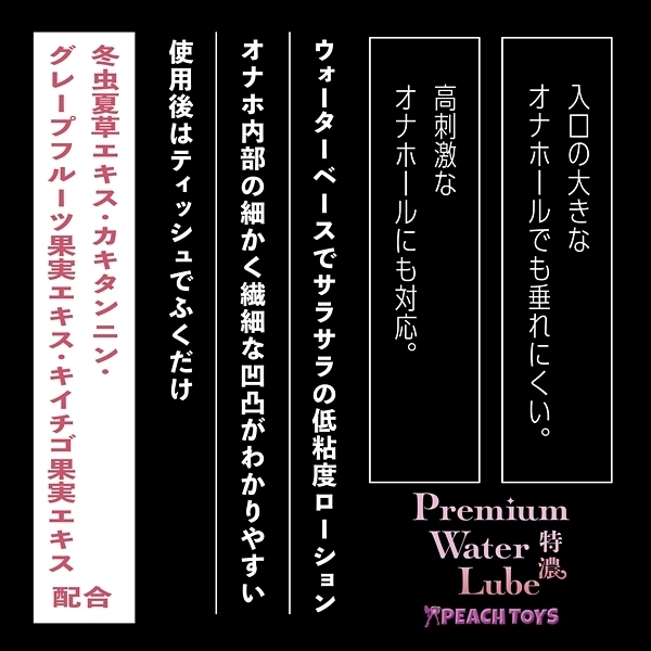 冬虫夏草エキス・カキタンニン・グレープフルーツ果実エキス・キイチゴ果実エキス配合●ウォーターベースでサラサラの超低粘度ローション●オナホ内部の細かく繊細な凹凸がわかりやすい●使用後はティッシュでふくだけ簡単●無香料●安心の日本製●200ml 特濃 <成分>水、プロパンジオール、ヒドロキシエチルセルロース、乳酸、キサンタンガム、ローヤルゼリーエキス、アルギニン、マカエキス、水溶性コラーゲン、グリチルリチン酸2K、ローズマリーエキス、モモ葉エキス、カキタンニン、銀、フユムシナツクサタケエキス、クエン酸、クエン酸Na、BG、エタノール、セルロースガム、炭酸水素Na、フェノキシエタノール、EDTA-2Na、ブチルカルバミン酸ヨウ化プロピニル
