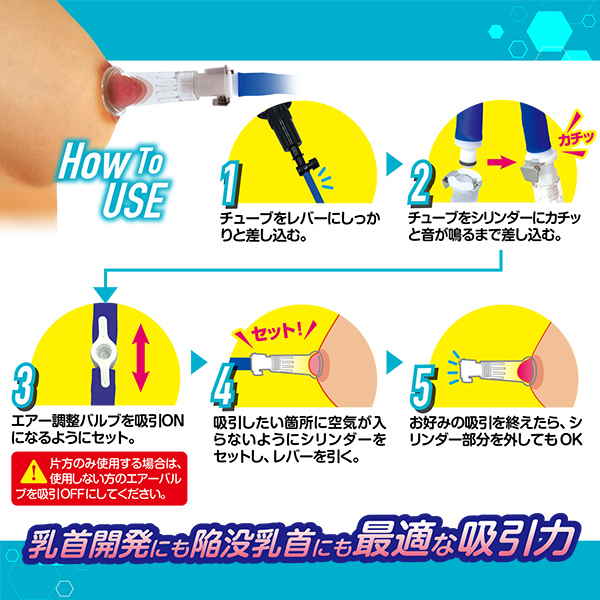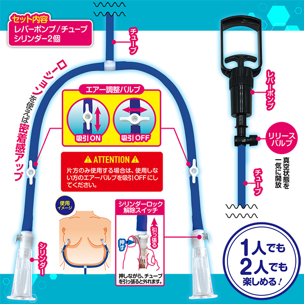 超強力吸引!1人でも2人でも楽しめる!!同時に乳首をW責め!!!シリンダーの径が小さいからピンポイントに超強力吸引!!!1個だけの吸引も可能。