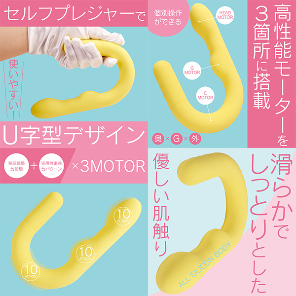 セルフケアをもっと自由に楽しめるU字型バイブレーターです♪ヘッド・Gポイント・外側刺激用の3箇所に、それぞれ独立したモーターを搭載!お好みに合わせて個別に振動を調整できるので、自分だけのリズムを作り出せます♪振動は5段階の強弱調整と5種類の多彩なパターンを組み合わせた、合計10種類を搭載!押し当てて楽しむ独特な形状が、自由な使い方をサポートします♪高性能モーターと高品質な素材を組み合わせた、安心のジャパンクオリティ!オールシリコンボディのしっとりとしたやさしい肌ざわりで、ストレスフリーな使用感を実現しました♪約120分の充電で、最大約60分の連続使用が可能!(使用環境により変動します!)IPX6対応の防水仕様で、清潔に保ちながら長くご使用いただけます♪