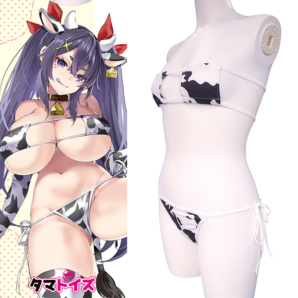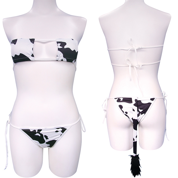大胆でセクシーな牛柄コスチュームで野生の魅力を解き放て!あなたの中のメス牛が疼きだす、露出度高めの眼帯ビキニとしっぽ付きの紐ビキニショーツ。