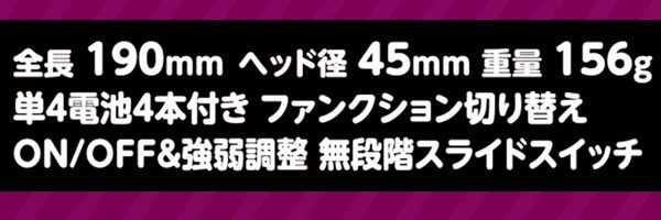 - パッケージ:22.8×16.3×5.5cm 本体:全長19.0cm ヘッド径4.5cm 重量:156g 電池:単四電池×4本使用