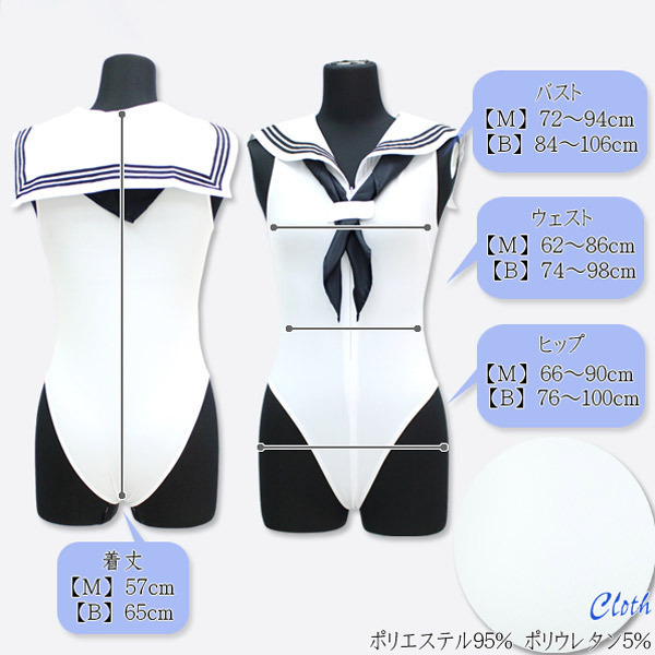 - BIGサイズ:B84〜106cm・W74〜98cm・H76〜100cm 着丈65cm セット内容:レオタード(前ファスナー)、スカーフ(マジックテープ) 素材:ポリエステル95%、ポリウレタン5% セーラーノースリーブレオタード 色:白