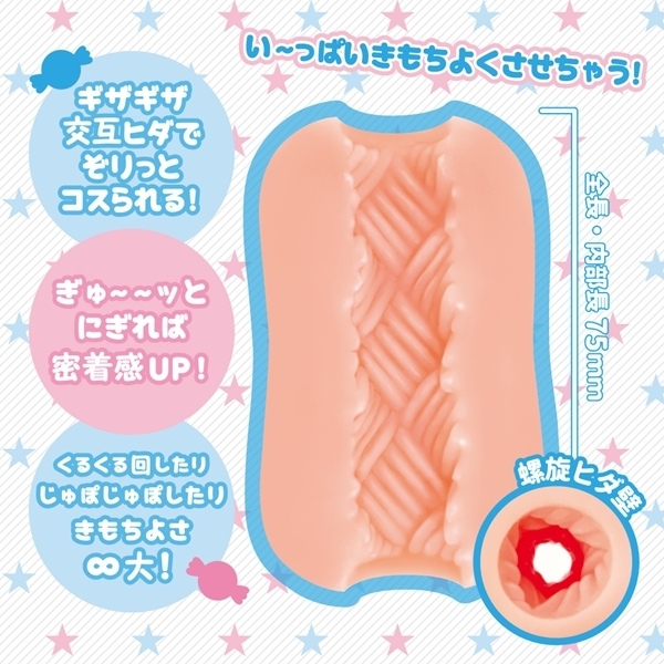 握るほど密着感UP!小悪魔ちっくな表情の可愛い妹パッケージの直径約75mmの小型オナホ(日本製)。