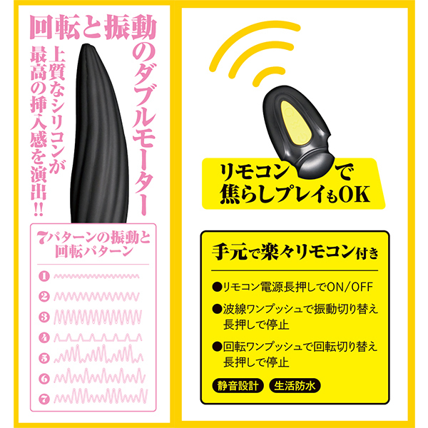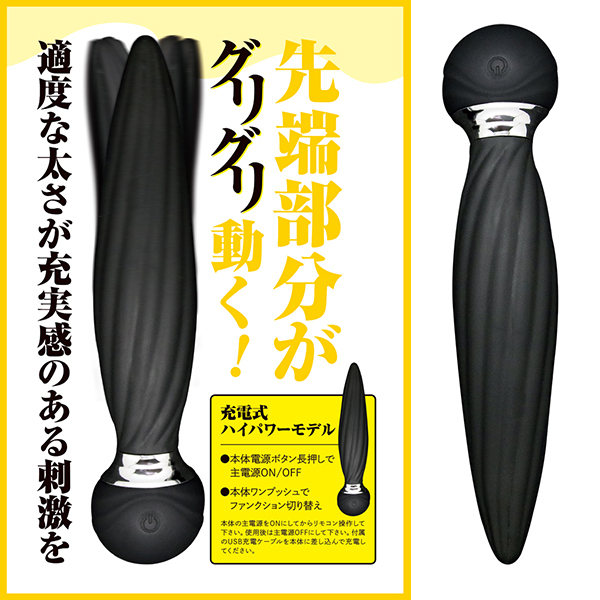 ぐりぐりと回転しながらの振動はこれまでにない快感!アナルプラグ系のフォルムですが、底部のストッパーがボール形状で挿入シャフトはツイスト加工済み♪ローションの滞留も期待できるナイスな設計となっております!7つの振動と回転が連動し、これらの動きを遠隔リモコンで操作できるので挿入しながらのパターン変化も楽しめます♪ボディはシリコン製で電源はUSB充電式!90分のフル充電で連続稼働45分!生活防水仕様でリモコンは電池式となっております。
