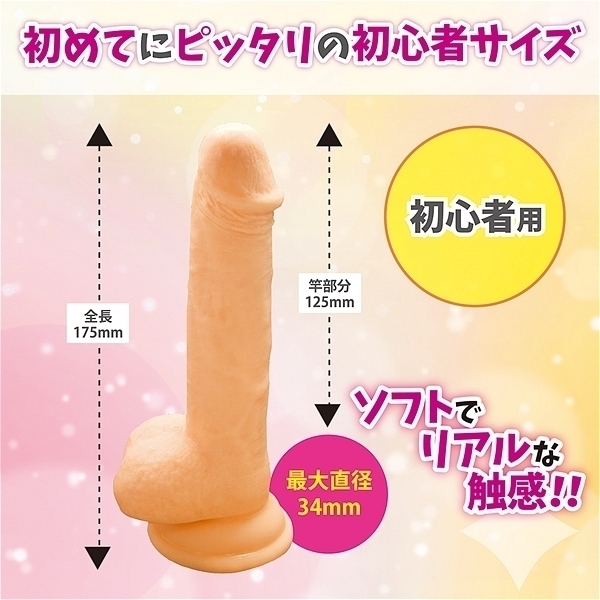 初めてにピッタリの初心者サイズ、初心者にも安心の細身タイプ、ソフトでリアルな触感!!しっかり固定できる大型吸盤付き、無理なくスムーズなストレートデザイン。