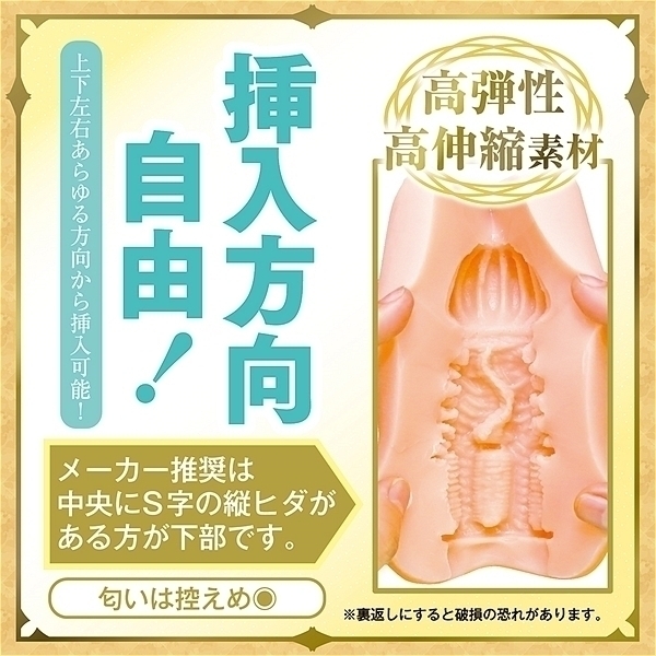 空気を抜けばバキューム効果でピタッと張り付き感触が変化する!挿入方向自由!左右上下あらゆる方向から使用可能(メーカー推奨は中央にS字の縦ヒダがある方が下部です)。