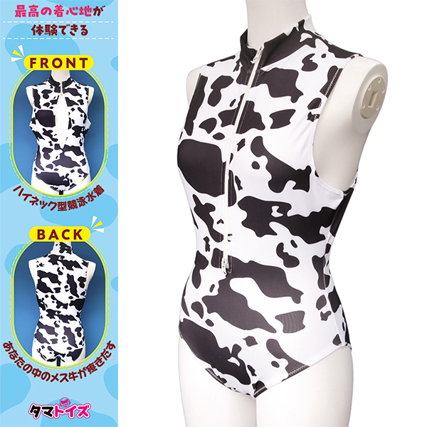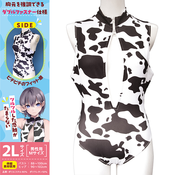 キュートな牛柄デザインのおとこの娘用競泳水着♪胸元は着やすいダブルファスナー仕様!ハイネック型でおしゃれに決まります♪伸縮性抜群の素材でピッタリ快適フィット!ポリエステル90%、ポリウレタン10%の高品質素材♪ツルツル滑らかな感触が心地よい仕上がりです!動きやすく、スポーツにもリラックスにも最適♪着るだけで気分も明るく楽しくなります!個性的でかわいい牛柄でおしゃれを楽しみましょう♪●TMT-1783