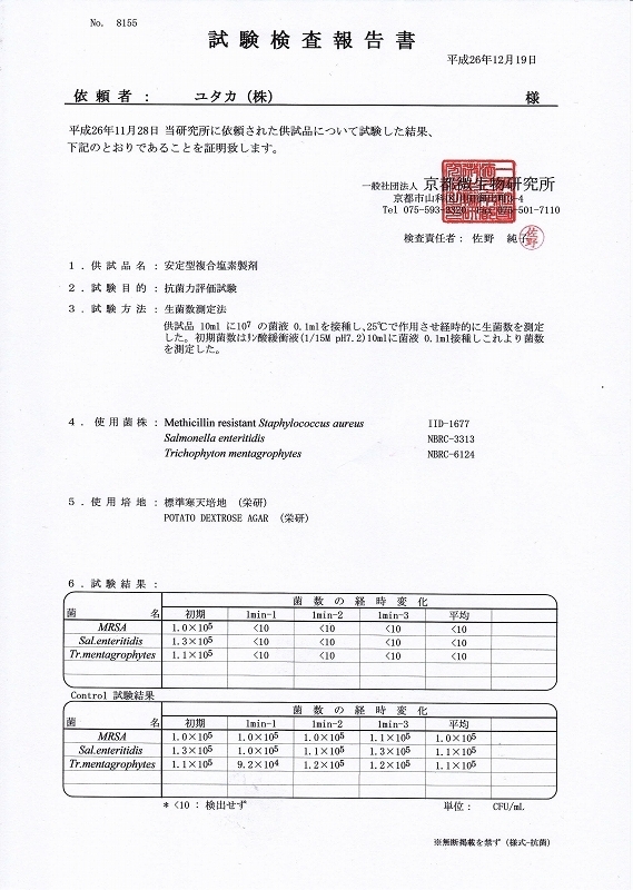※<新型コロナウイルス不活化について>上記試験において現在のところ新型コロナウイルスでの試験ができない状況の為新型コロナウイルスを不活化できる事を言及するものではございません。