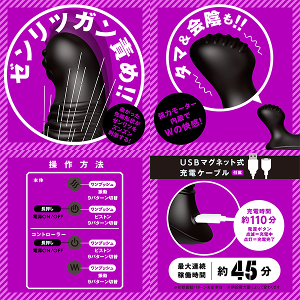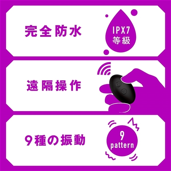 ※本体:連続稼働時間約45分(初期振動パターン未変更時)IPX7等級 9パターン振動 付属品:リモコン_USBマグネット式充電コード